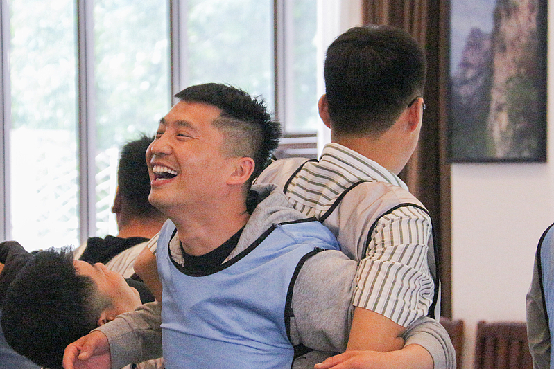 在“創(chuàng)新思維”和“啞人筑塔”活動環(huán)節(jié)中,需要各隊員在規(guī)定的時間內(nèi)有序完成各項挑戰(zhàn)任務。計時開始后,每支隊伍都全身心投入活動中,小分隊間的合作也更加得心應手。夏風輕拂,大家的興致也愈發(fā)高漲,不一會兒就有隊員示意教練已完成任務。